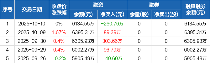 大宏立:融资净偿还260.76万元,融资余额6134.55万元(10-10)