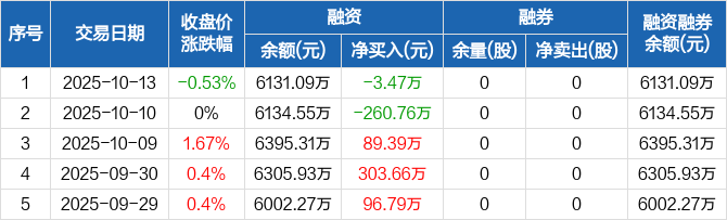 大宏立:融资净偿还3.47万元,融资余额6131.09万元(10-13)