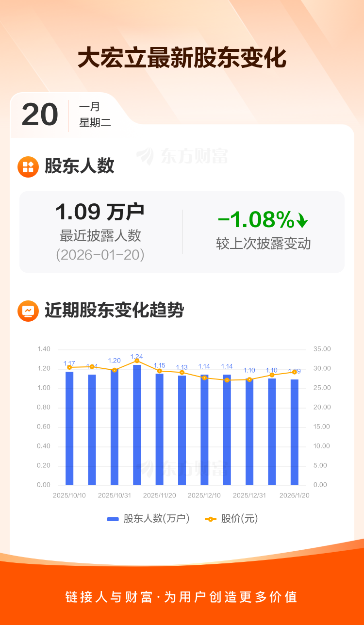 大宏立最新披露数据显示,截至1月20日公司股东户数为1.09万户,较上期(2026年1月9日)减少119户,降幅为1.08%。户均持有流通股数量由上期的5123股上升至5179股,户均持股金额由上期的14.55万元增加至15.10万元。