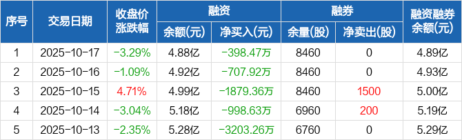 融资方面,当日融资买入2313.21万元,融资偿还2711.68万元,融资净偿还398.47万元,连续5日净偿还累计7187.65万元。融券方面,融券卖出0股,融券偿还0股,融券余量8460股,融券余额97.1万元。融资融券余额合计4.89亿元。