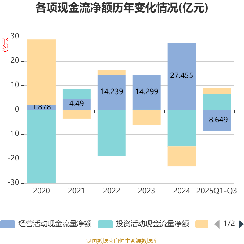 2025年前三季度,公司经营活动现金流净额为-8.65亿元,同比减少25.16亿元;筹资活动现金流净额2.43亿元,同比增加10.76亿元;投资活动现金流净额6.44亿元,上年同期为-7.95亿元。
