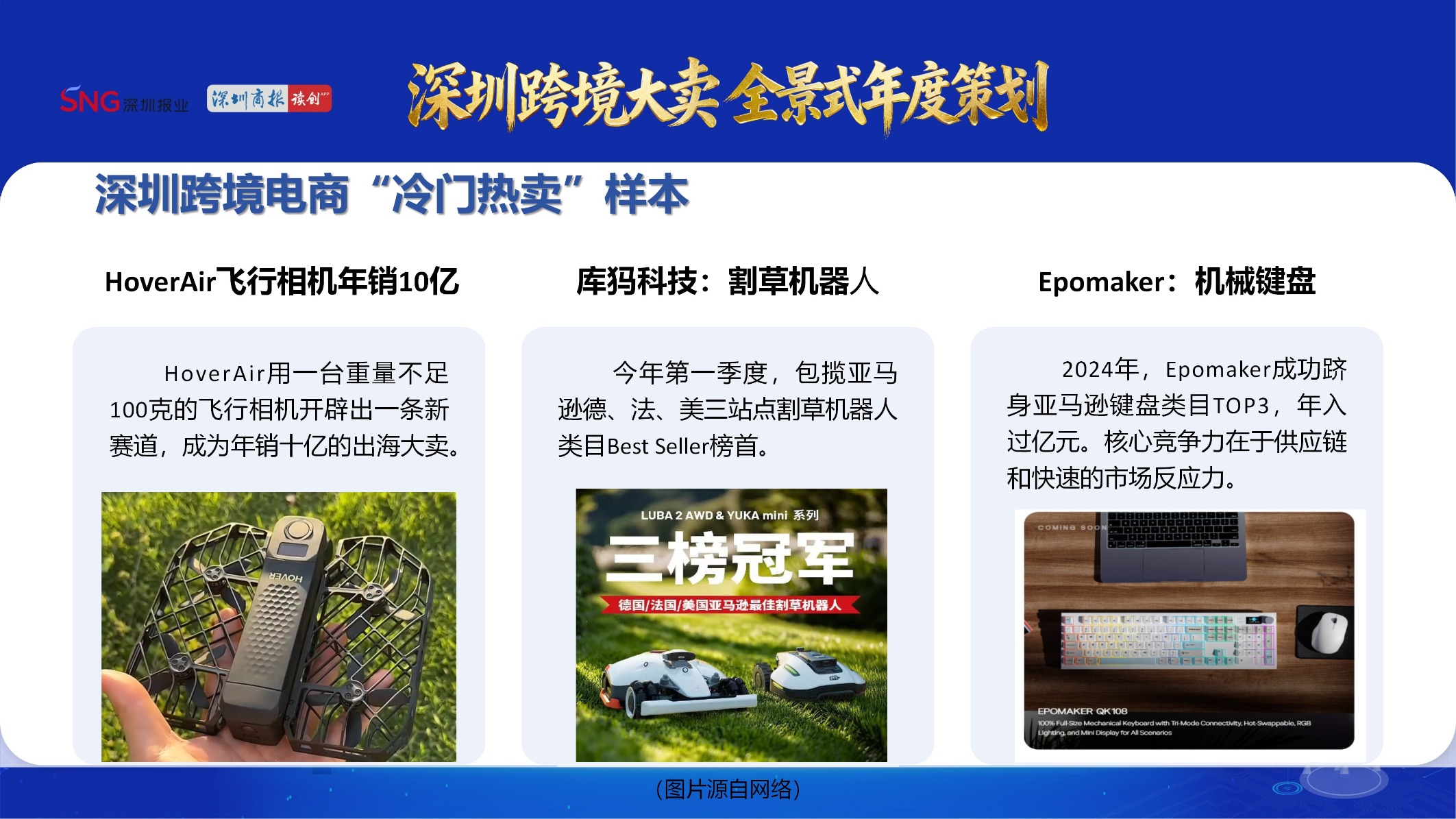 “黑马”型特色卖家,亦是重要的报道对象。从年销10亿元的飞行相机、霸榜亚马逊销售榜的割草机器人,再到年入上亿元的机械键盘,这些“冷门爆品”背后的企业,成为深圳跨境电商另一增长极,在海外书写深圳特色品牌故事。