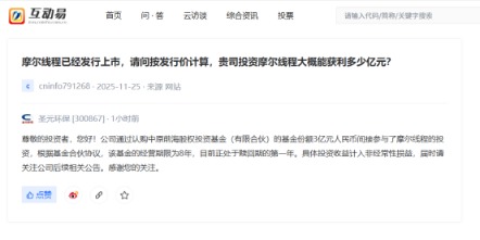 圣元环保11月26日在互动平台回答投资者提问时表示,公司通过认购中原前海股权投资基金(有限合伙)的基金份额3亿元人民币间接参与了摩尔线程的投资,根据基金合伙协议,该基金的经营期限为8年,目前正处于赎回期的第一年。具体投资收益计入非经常性损益,届时请关注公司后续相关公告。