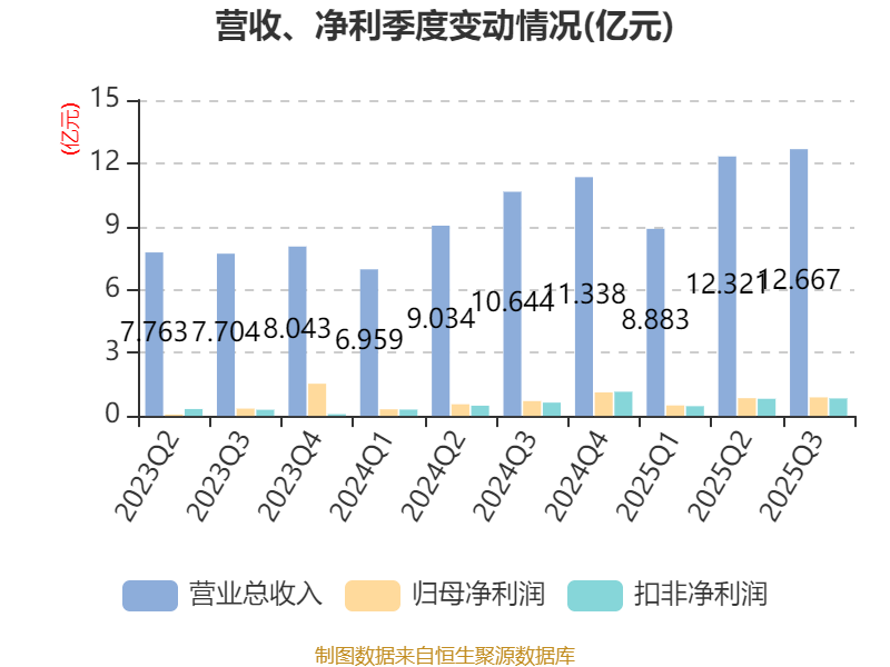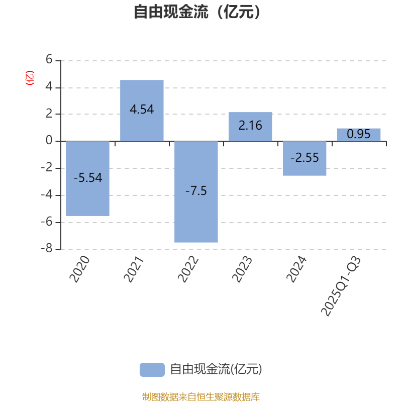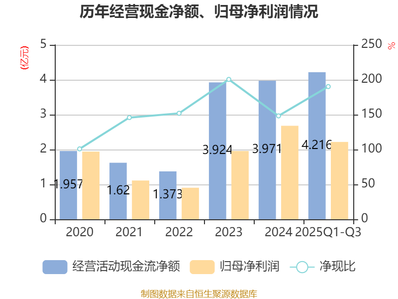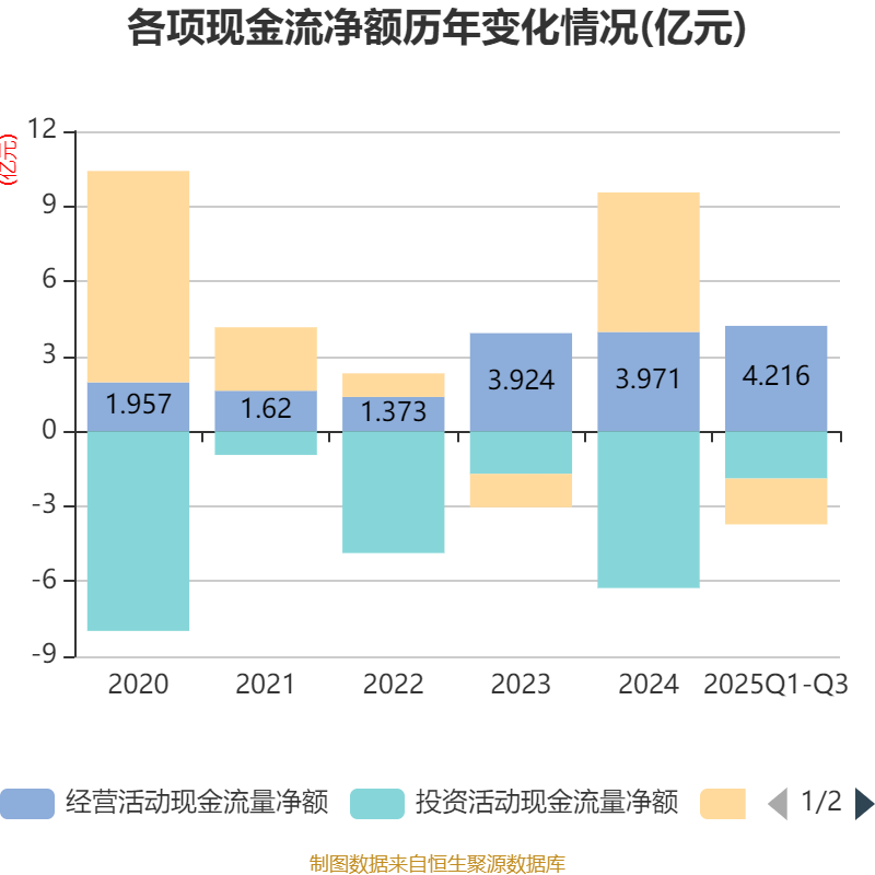 2025年前三季度,公司经营活动现金流净额为4.22亿元,同比增长75.07%;筹资活动现金流净额-1.83亿元,同比减少8.08亿元;投资活动现金流净额-1.89亿元,上年同期为-2.5亿元。