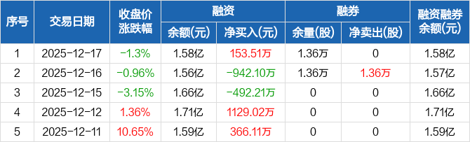 融资方面,当日融资买入1565.63万元,融资偿还1412.12万元,融资净买入153.51万元。融券方面,融券卖出0股,融券偿还0股,融券余量1.36万股,融券余额27.78万元。融资融券余额合计1.58亿元。