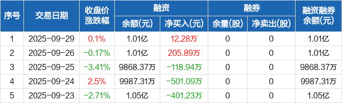 捷强装备:融资净买入12.28万元,融资余额1.01亿元(09-29)