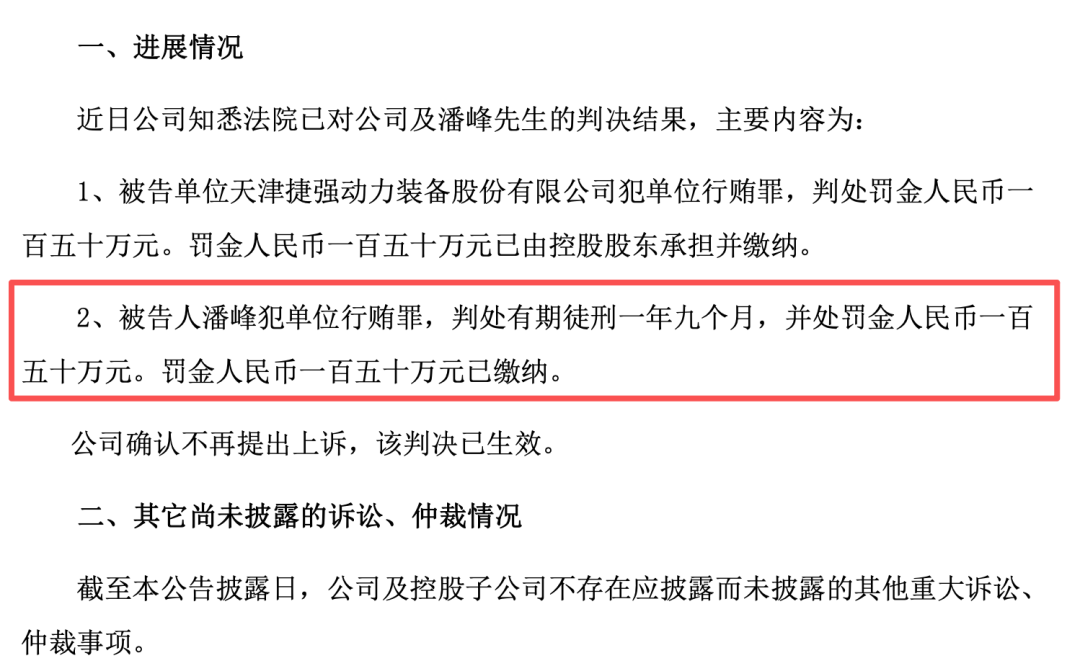 捷强装备(300875)犯单位行贿罪被罚150万元,实控人潘峰获刑一年九个月。