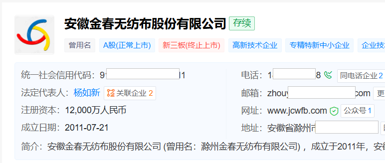 天眼查显示,金春股份成立于2011年7月,总部位于安徽省滁州市,2020年8月在深交所创业板上市,是一家专业从事非织造布材料、非织造布制品以及化学纤维的生产和销售的企业。