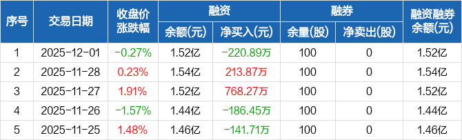 金春股份:融资净偿还220.89万元,融资余额1.52亿元(12-01)
