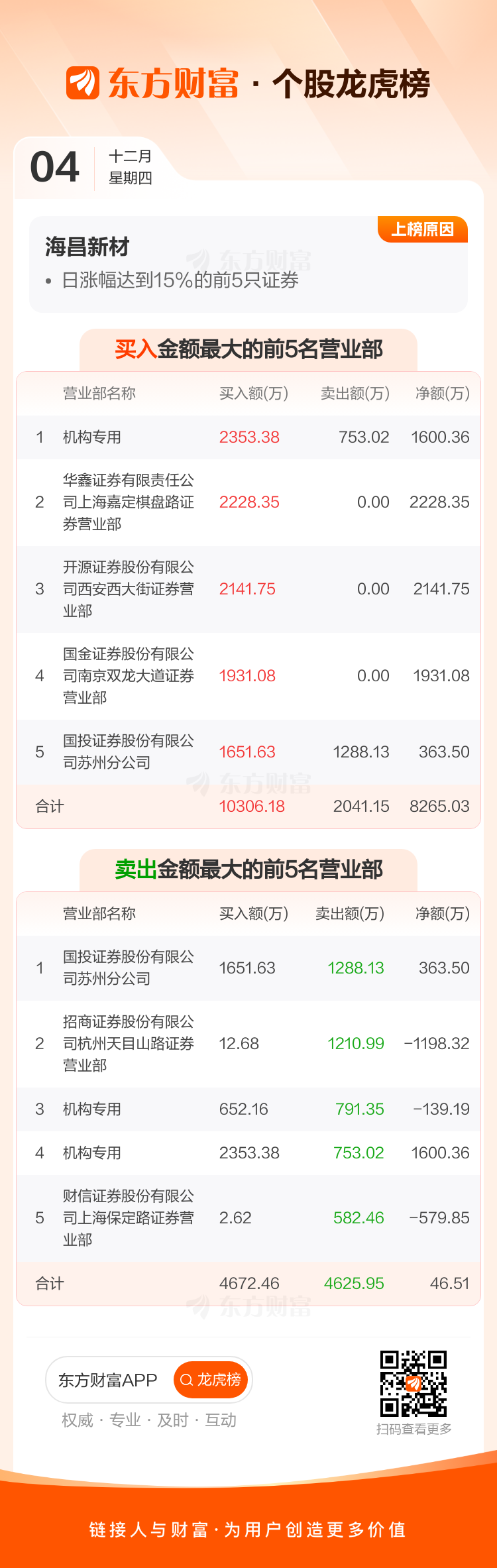 交易所2025年12月4日公布的交易公开信息显示,海昌新材因成为日涨幅达到15%的前5只证券上榜。海昌新材当日收报25.57元,涨跌幅19.99%,偏离值20.00%,换手率18.66%,成交额7.43亿。