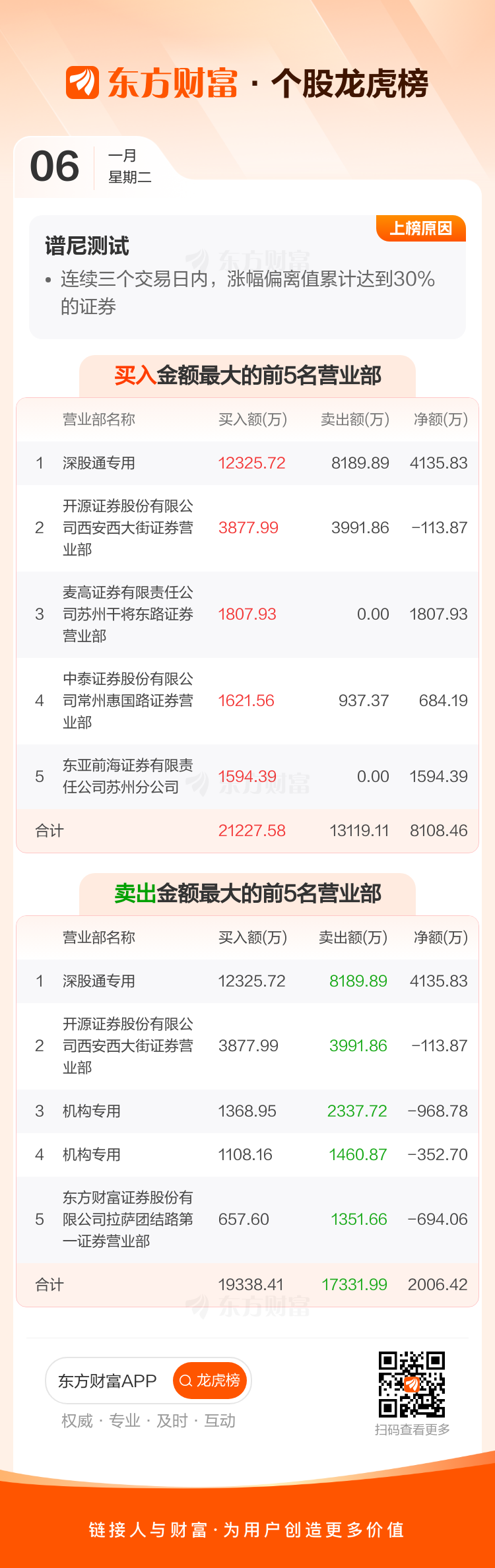交易所2026年1月6日公布的交易公开信息显示,谱尼测试因成为日涨幅达到15%的前5只证券、连续三个交易日内,涨幅偏离值累计达到30%的证券上榜。谱尼测试当日收报13.82元,涨跌幅19.97%,偏离值20.00%,换手率28.57%,成交额13.85亿。异常期间1月5日至1月6日,期间涨幅43.96%,累计偏离值40.29%,区间成交额20.97亿。