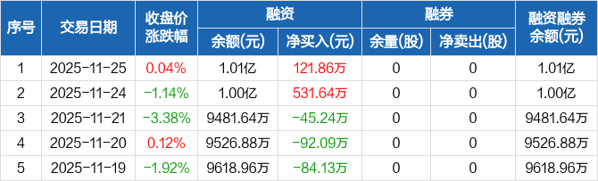 融资方面,当日融资买入689.74万元,融资偿还567.88万元,融资净买入121.86万元。融券方面,融券卖出0股,融券偿还0股,融券余量0股,融券余额0元。融资融券余额合计1.01亿元。