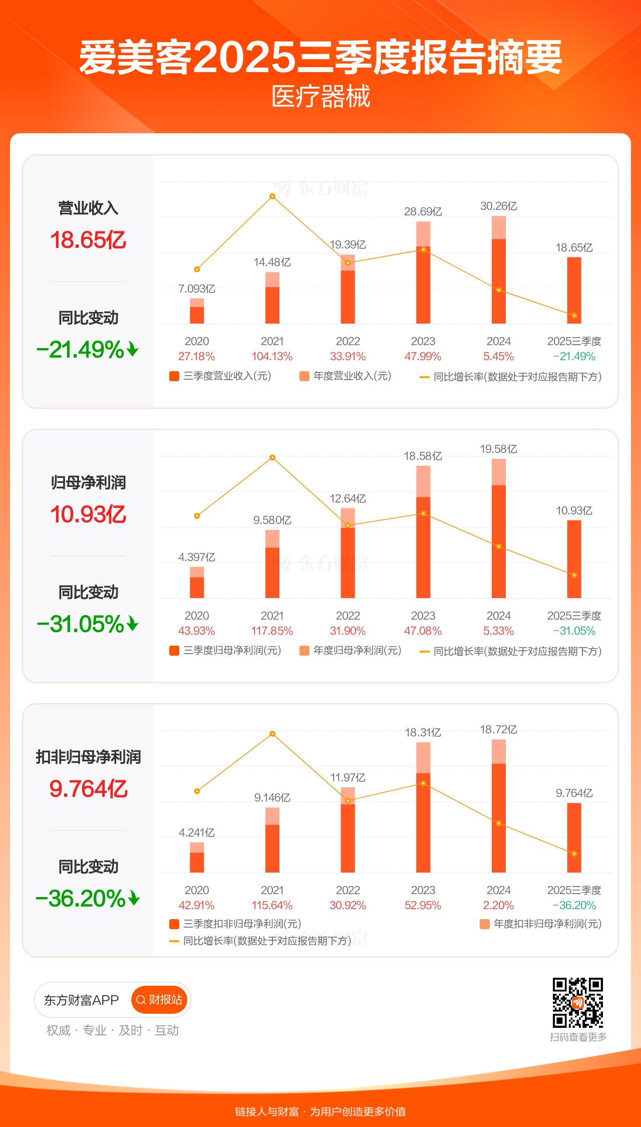 爱美客10月29日发布2025年三季报显示,公司前三季实现营业收入18.65亿元,同比下滑21.49%;归母净利润10.93亿元,同比下滑31.05%;扣非归母净利润9.76亿元,同比下滑36.20%。