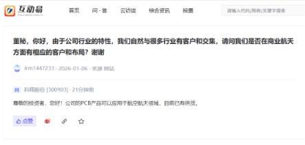 科翔股份:公司的PCB产品可以应用于航空航天领域 目前已有供货