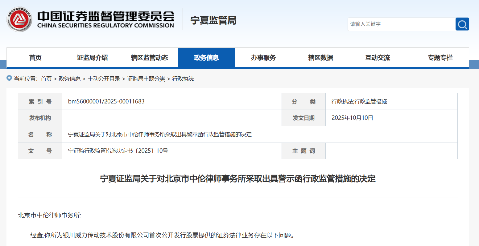 根据宁夏证监局在2025年10月10日发布的决定,北京市中伦律师事务所因其为威力传动(300904)首次公开发行股票提供的证券法律业务存在多项问题,受到出具警示函的行政监管措施。