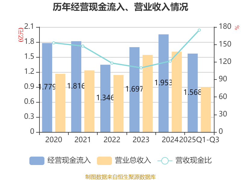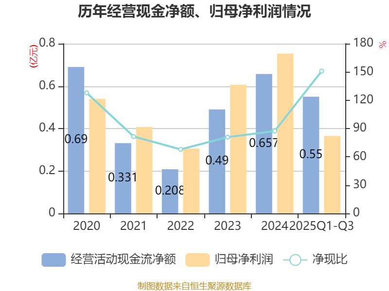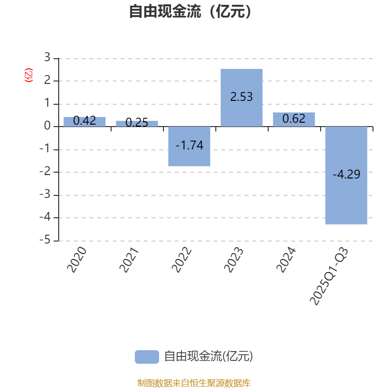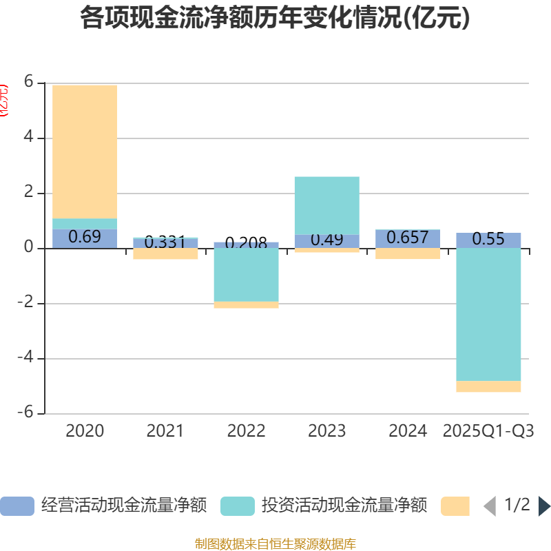 2025年前三季度,公司经营活动现金流净额为5499.28万元,同比增长121.63%;筹资活动现金流净额-4012.87万元,同比增加1.67万元;投资活动现金流净额-4.83亿元,上年同期为-3.31亿元。