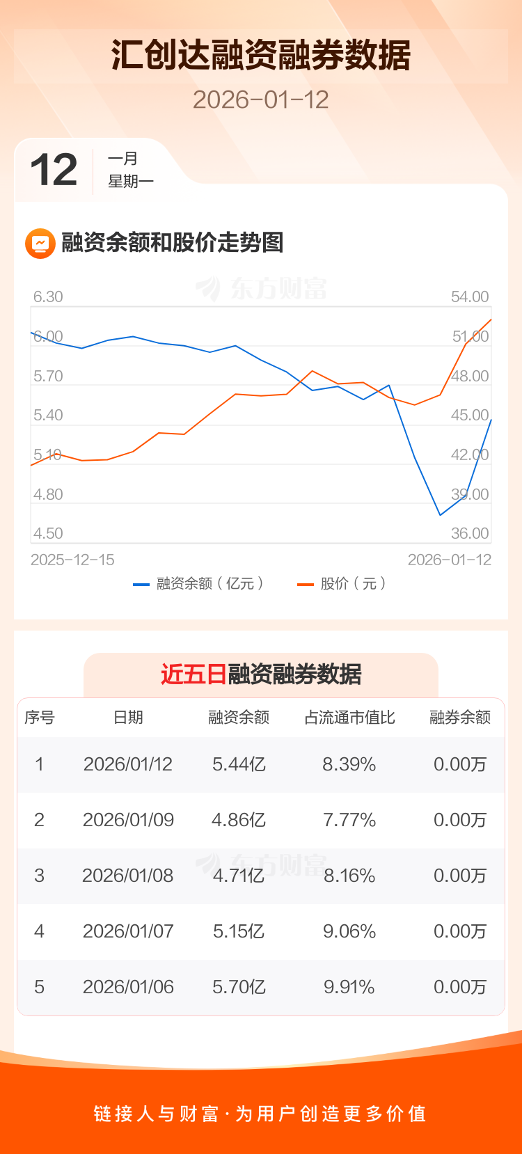 交易所最新数据显示,汇创达于2026年1月12日获融资买入1.18亿元,融资偿还5960.26万元,当日融资净买入5800.05万元。目前,该股融资余额5.44亿,占流通市值比例为8.39%。