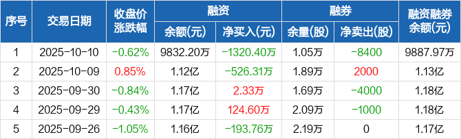 瑞丰新材:融资净偿还1320.4万元,融资余额9832.2万元(10-10)