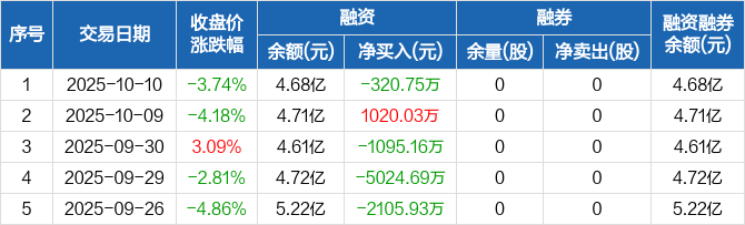 融资方面,当日融资买入4024.66万元,融资偿还4345.4万元,融资净偿还320.75万元。融券方面,融券卖出0股,融券偿还0股,融券余量0股,融券余额0元。融资融券余额合计4.68亿元。