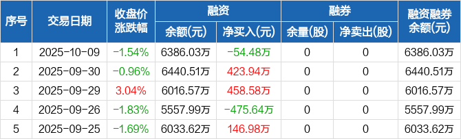 凯龙高科:融资净偿还54.48万元,融资余额6386.03万元(10-09)
