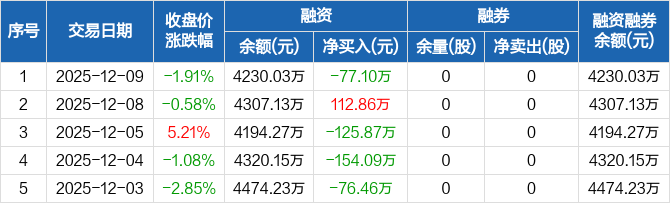 凯龙高科:融资净偿还77.1万元,融资余额4230.03万元(12-09)