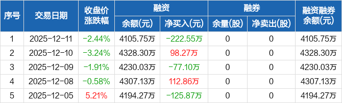 凯龙高科:融资净偿还222.55万元,融资余额4105.75万元(12-11)