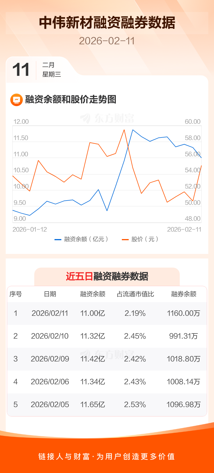 交易所最新数据显示,中伟新材于2026年2月11日获融资买入1.39亿元,融资偿还1.71亿元,当日融资净偿还3212.72万元。目前,该股融资余额11.00亿,占流通市值比例为2.19%。
