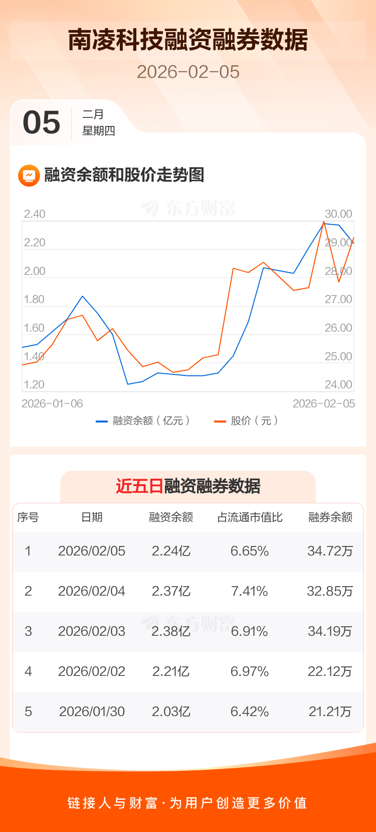 交易所最新数据显示,南凌科技于2026年2月5日获融资买入1.03亿元,融资偿还1.15亿元,当日融资净偿还1231.36万元。目前,该股融资余额2.24亿,占流通市值比例为6.65%。