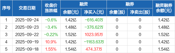 天秦装备:融资净偿还616.4万元,融资余额1.42亿元(09-24)