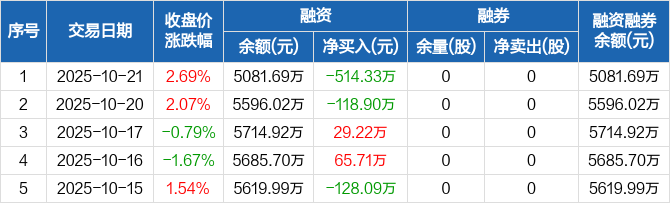 研奥股份:融资净偿还514.33万元,融资余额5081.69万元(10-21)