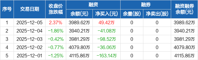 研奥股份:融资净买入49.42万元,融资余额3989.62万元(12-05)