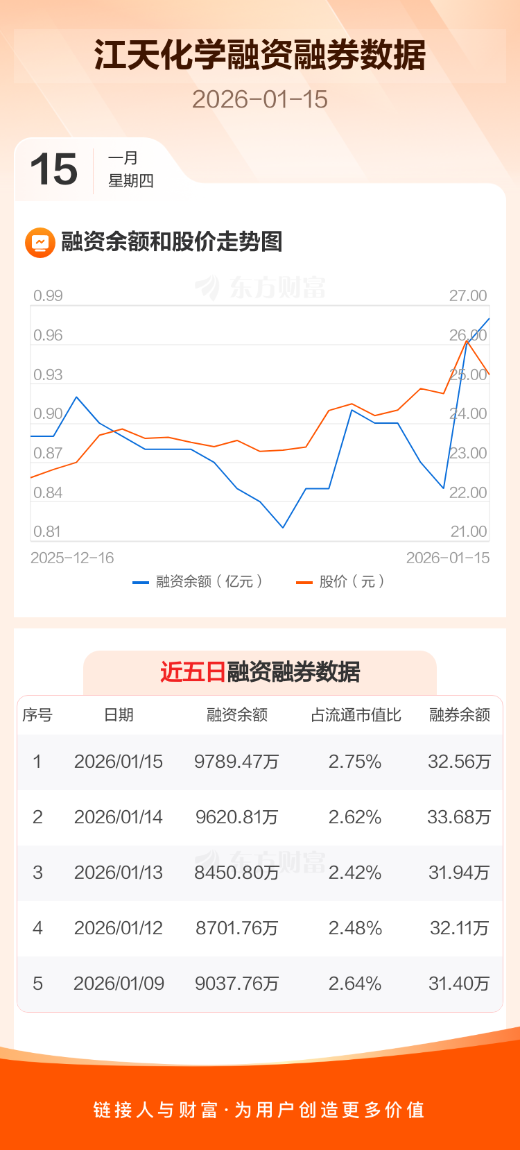 交易所最新数据显示,江天化学于2026年1月15日获融资买入1707.38万元,融资偿还1538.71万元,当日融资净买入168.67万元。目前,该股融资余额9789.47万,占流通市值比例为2.75%。