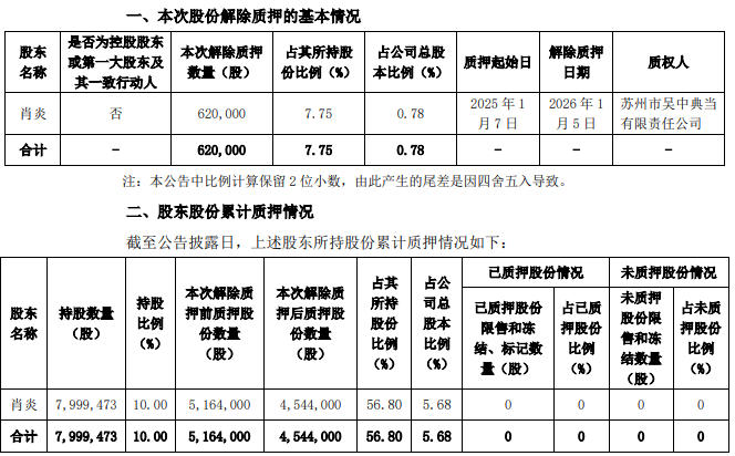 华安鑫创股东肖炎所持62万股公司股份解押