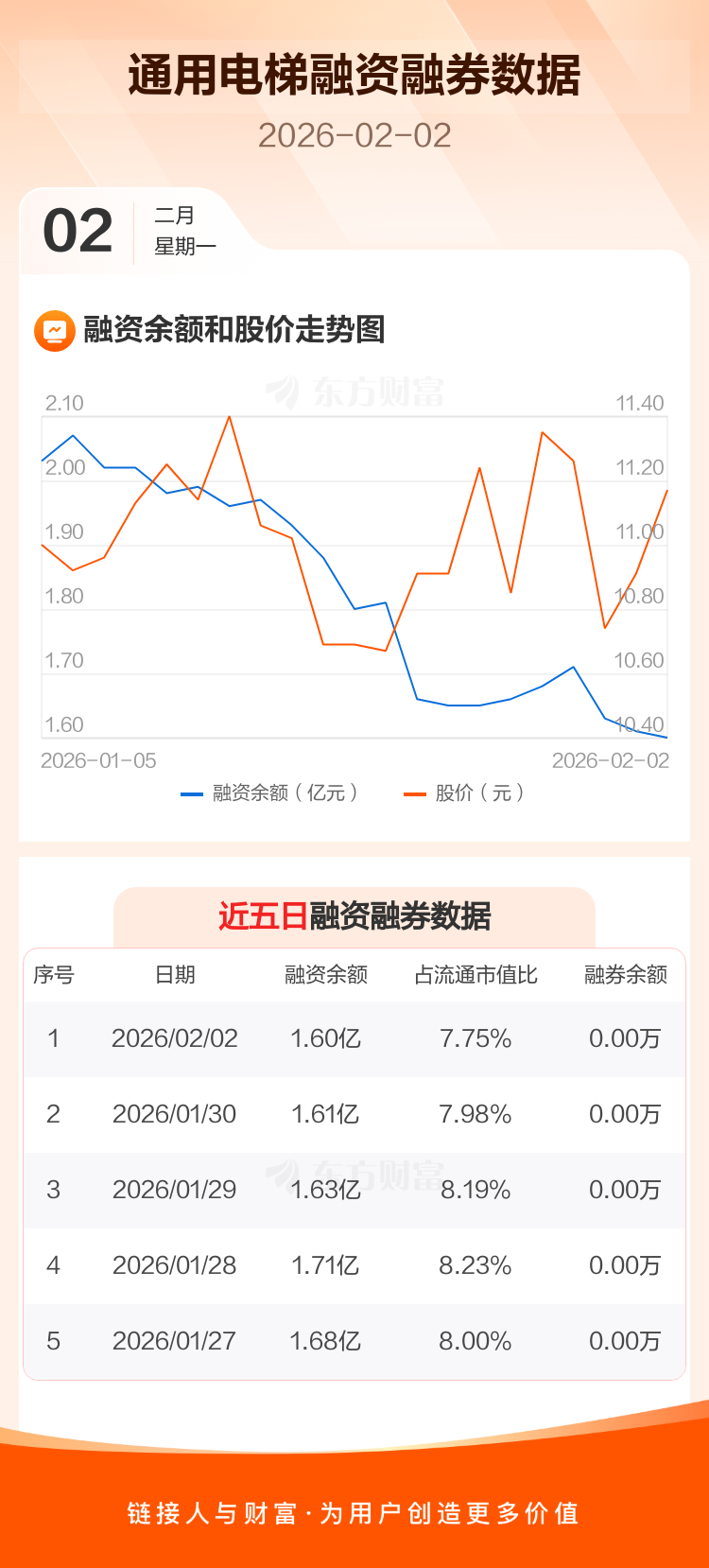 交易所最新数据显示,通用电梯于2026年2月2日获融资买入619.58万元,融资偿还710.34万元,当日融资净偿还90.76万元。目前,该股融资余额1.60亿,占流通市值比例为7.75%。