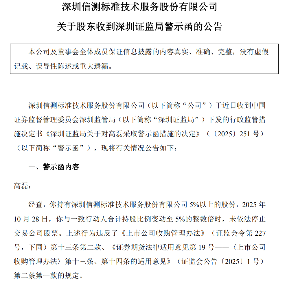 信测标准(300938)12月12日晚间公告称,公司于近日收到深圳证监局下发的行政监管措施决定书《深圳证监局关于对高磊采取警示函措施的决定》。高磊作为持有公司5%以上股份的股东,在与一致行动人合计持股比例变动至5%的整数倍时,未依法停止交易公司股票。上述行为违反了《上市公司收购管理办法》相关规定。深圳证监局决定对高磊采取出具警示函的行政监管措施。