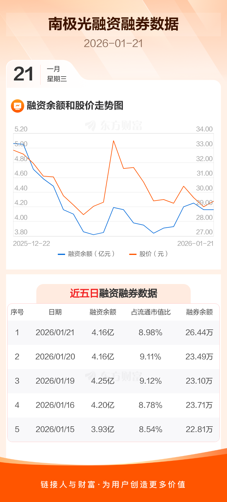 交易所最新数据显示,南极光于2026年1月21日获融资买入1561.66万元,融资偿还1592.50万元,当日融资净偿还30.85万元。目前,该股融资余额4.16亿,占流通市值比例为8.98%。