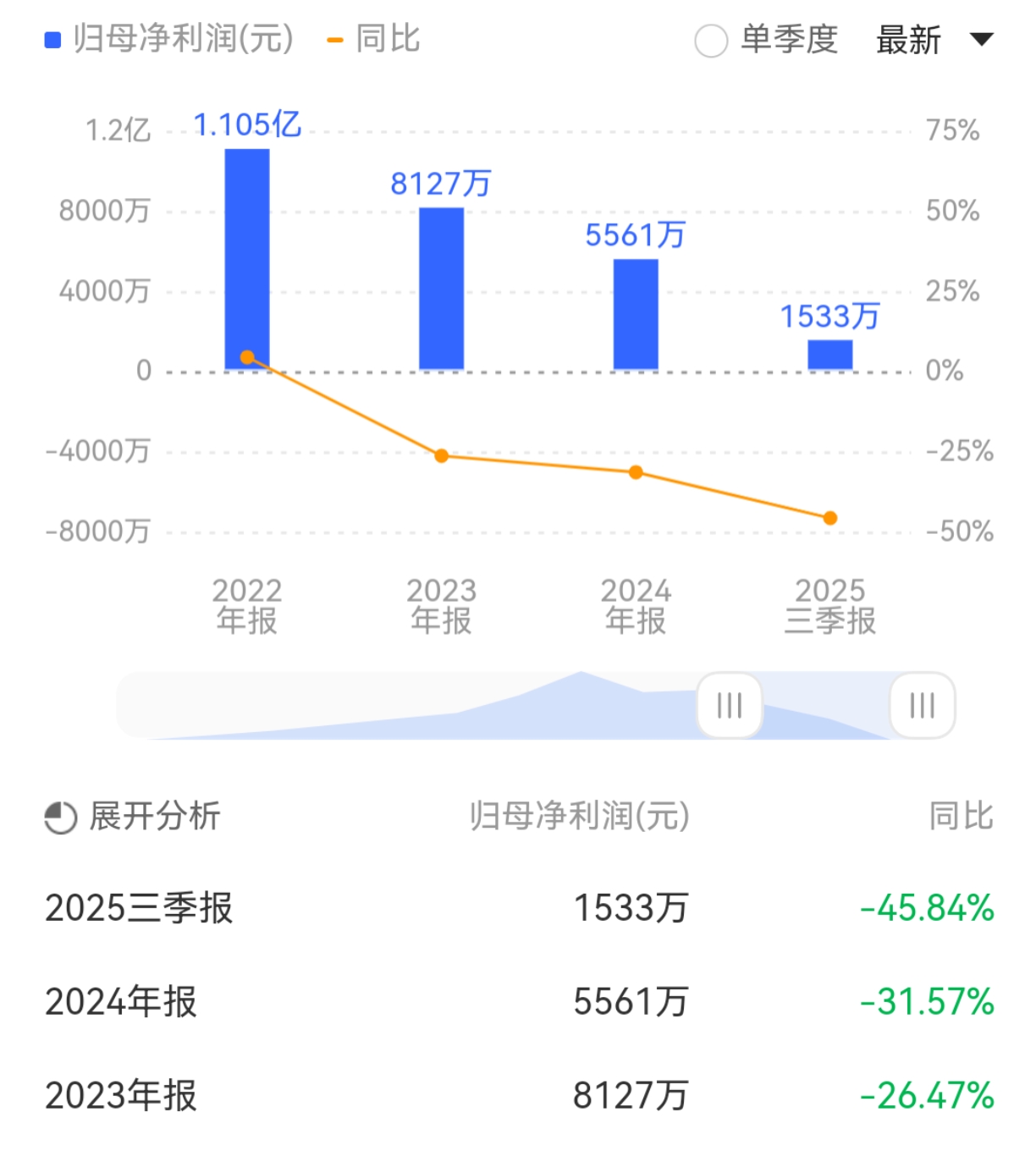 2025年前三季度,公司营业收入为1.56亿元,同比增长15.45%;归母净利润为1532.60万元,同比下降45.84%;扣非归母净利润为1498.59万元,同比下降43.96%。