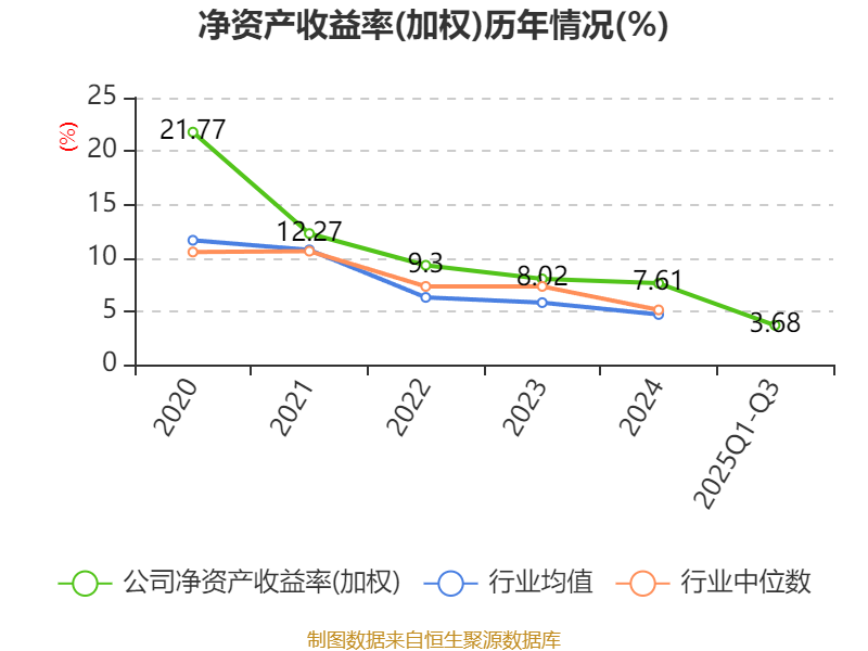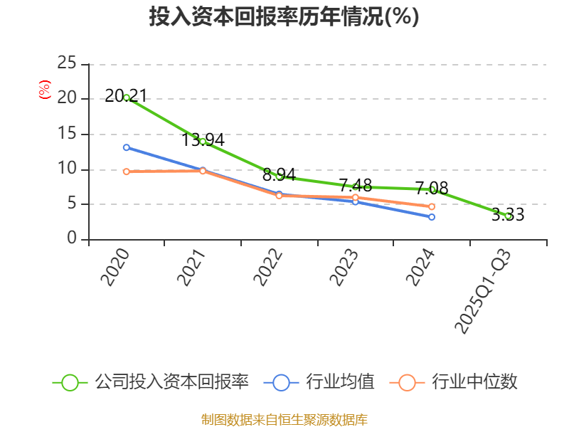 盈利能力方面, 2025年前三季度公司加权平均净资产收益率为3.68%,同比下降3.21个百分点。公司2025年前三季度投入资本回报率为3.33%,较上年同期下降3.07个百分点。