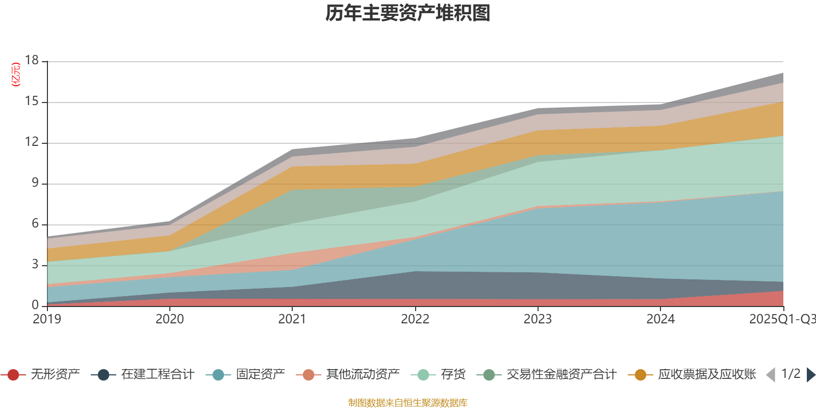 资产重大变化方面,截至2025年三季度末,公司在建工程合计较上年末减少55.48%,占公司总资产比重下降6.3个百分点;无形资产较上年末增加119.6%,占公司总资产比重上升3.04个百分点;应收票据及应收账款较上年末增加38.71%,占公司总资产比重上升2.42个百分点;存货较上年末增加8.5%,占公司总资产比重下降1.58个百分点。