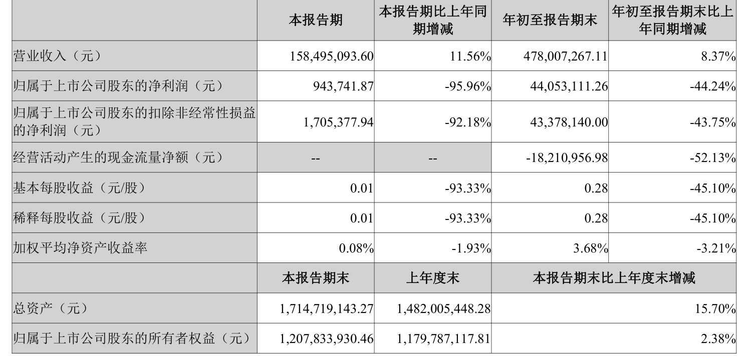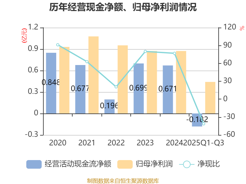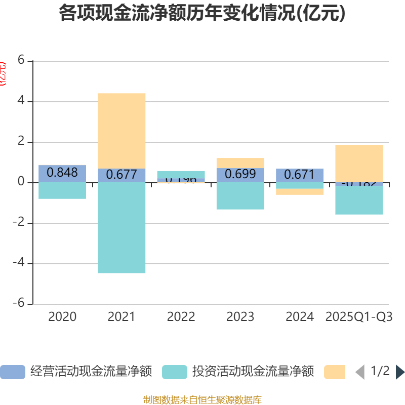 2025年前三季度,公司经营活动现金流净额为-1821.1万元,同比减少624.01万元;筹资活动现金流净额1.85亿元,同比增加2.28亿元;投资活动现金流净额-1.41亿元,上年同期为472.18万元。