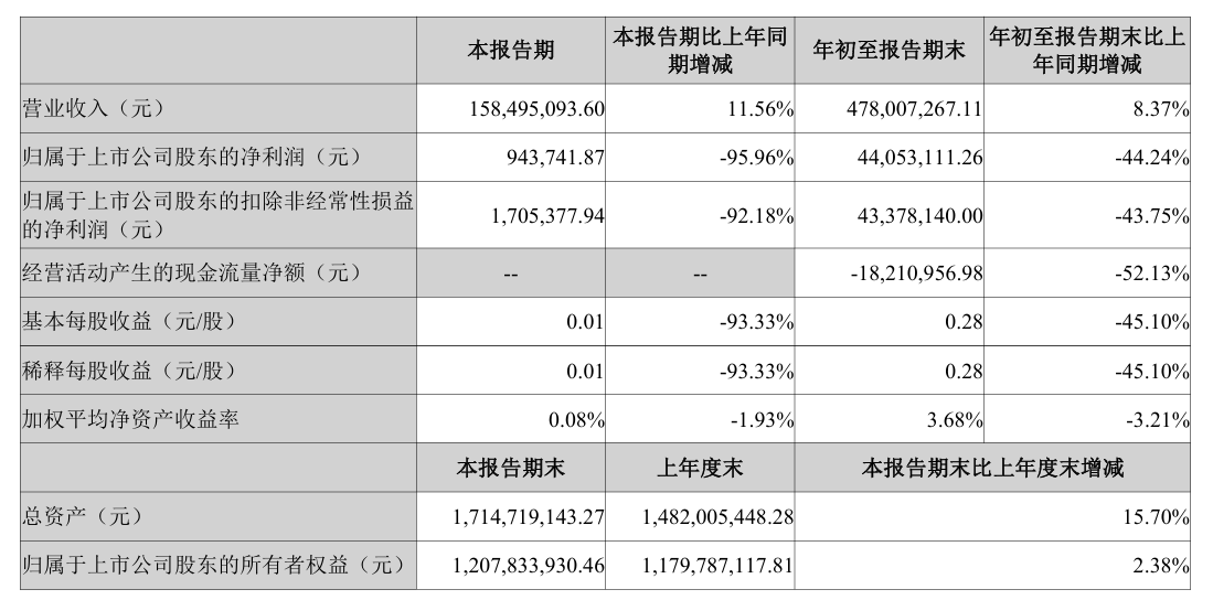 10月20日晚间,恒而达(深市代码:300946)发布2025年三季度报告。数据显示,该公司第三季度营业收入为1.58亿元,同比增长11.56%;归属于上市公司股东的净利润为94.37万元,同比锐减95.96%。