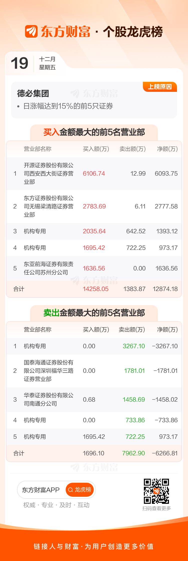 交易所2025年12月19日公布的交易公开信息显示,德必集团因成为日涨幅达到15%的前5只证券上榜。德必集团当日收报22.51元,涨跌幅19.99%,偏离值20.00%,换手率21.46%,成交额7.04亿。