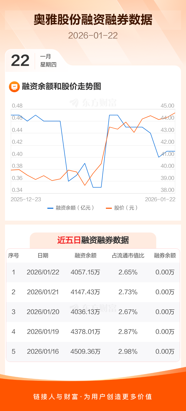 交易所最新数据显示,奥雅股份于2026年1月22日获融资买入438.33万元,融资偿还528.60万元,当日融资净偿还90.28万元。目前,该股融资余额4057.15万,占流通市值比例为2.65%。