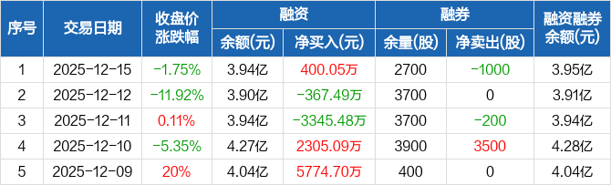 线上线下融资融券信息显示,2025年12月15日融资净买入400.05万元;融资余额3.94亿元,较前一日增加1.03%