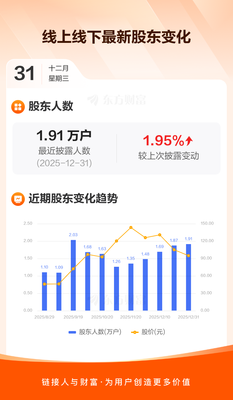 线上线下最新披露数据显示,截至12月31日公司股东户数为1.91万户,较上期(2025年12月19日)增加366户,增幅为1.95%。户均持有流通股数量由上期的2792股下降至2739股,户均持股金额由上期的29.30万元减少至25.94万元。