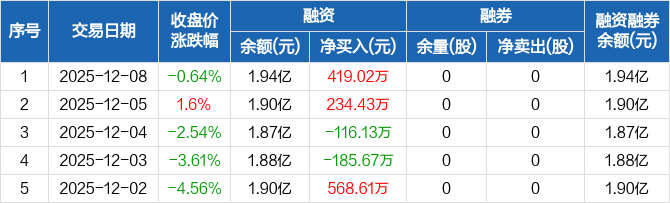 中金辐照:融资净买入419.02万元,融资余额1.94亿元(12-08)