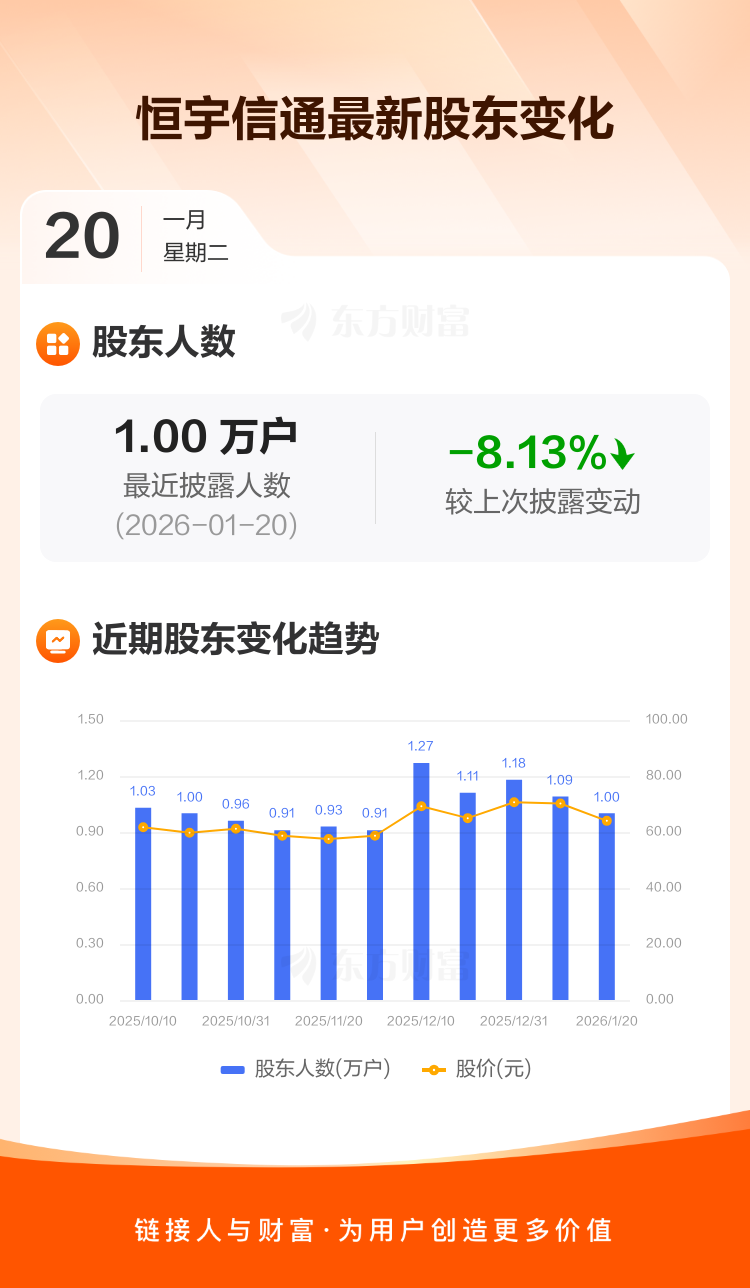 恒宇信通最新披露数据显示,截至1月20日公司股东户数为9981户,较上期(2026年1月10日)减少883户,降幅为8.13%。户均持有流通股数量由上期的5128股上升至5581股,户均持股金额由上期的35.99万元减少至35.71万元。