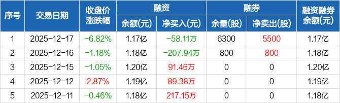 融资方面,当日融资买入1671.65万元,融资偿还1729.76万元,融资净偿还58.11万元。融券方面,融券卖出5500股,融券偿还0股,融券余量6300股,融券余额14.21万元。融资融券余额合计1.17亿元。