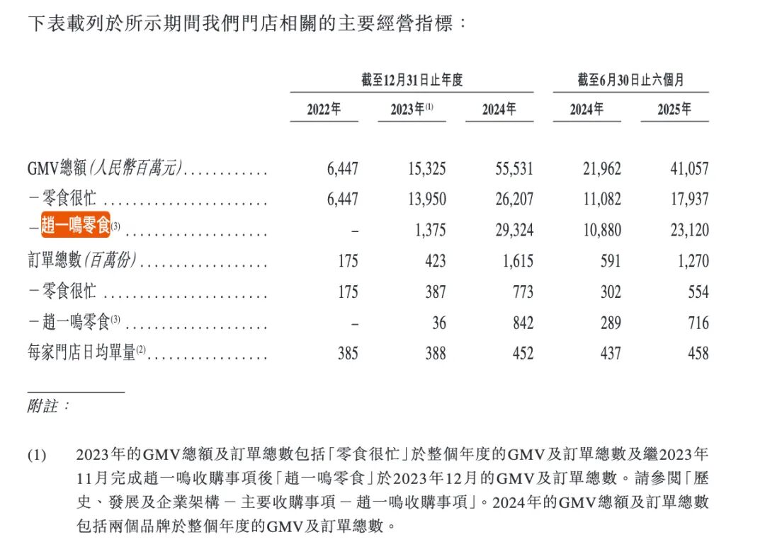 鸣鸣很忙由“零食很忙”“赵一鸣零食”两大零食品牌合并而成,二者分别创立于2017年、2019年,2023年11月完成合并。拆分来看,上半年,赵一鸣零食实现GMV 231.2亿元,对应订单总数7.16亿份;零食很忙订单总数5.54亿份,实现GMV 179.37亿元。