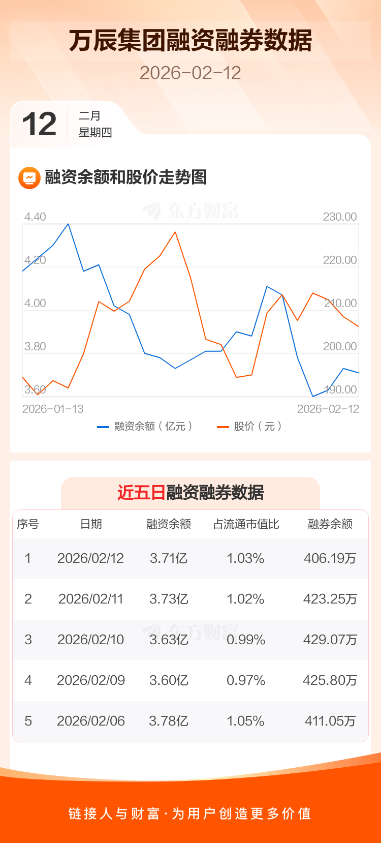 交易所最新数据显示,万辰集团于2026年2月12日获融资买入1802.83万元,融资偿还2002.83万元,当日融资净偿还200万元。目前,该股融资余额3.71亿,占流通市值比例为1.03%。